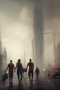Post navigation a-group-of-people-walking-through-a-dirty-city-with-a-giant-structure-in-the-background-and-a-giant–(11)